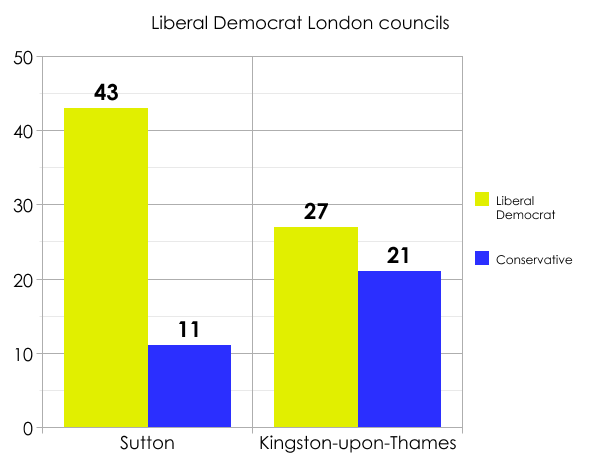The party controls two boroughs. The Lib Dems are perfectly safe in Sutton, but I wonder what will happen in Kingston-upon-Thames, where the Tories need to take only four seats to seize power.