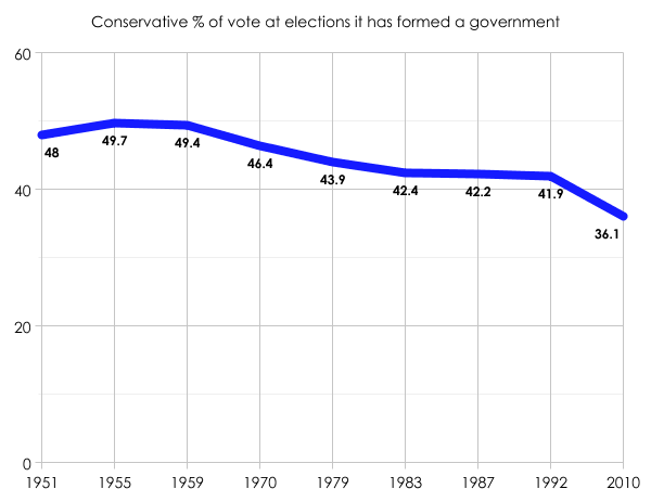 Now here’s the Conservative share of the vote since the war in every election in which it has won power: