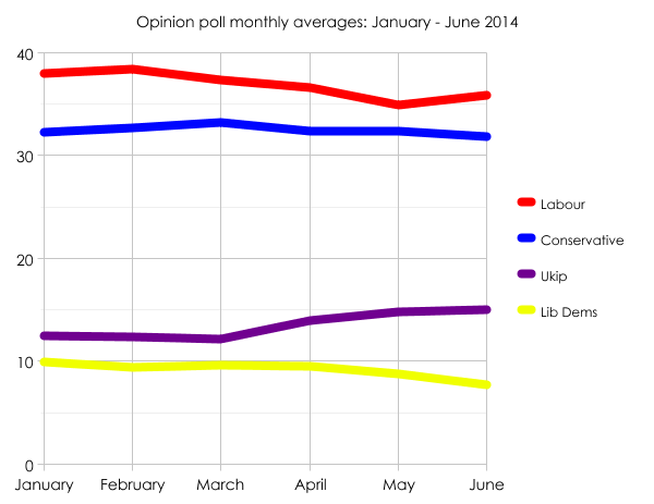 Were the parties’ current poll averages reproduced at a general election, on a uniform swing Labour would end up with 347 seats: a majority of 44. The Tories would win 256 seats, the Lib Dems 21, and others 26. Ukip would not win any seats.