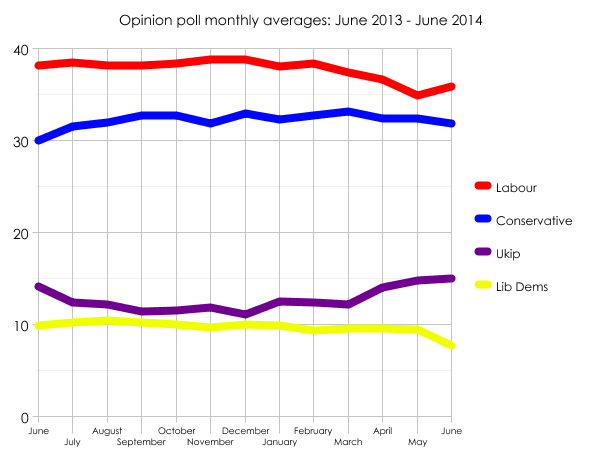 Labour’s average is tracking at 35.9%: a whole percentage point higher than May. The lowest figure the party has scored in any poll so far in June has been 34%; the lowest in May was 31%.