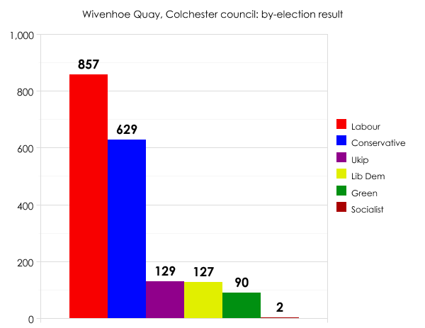 Labour held one of its eight seats on Colchester council in Essex with a 3.9% swing from the Tories:
