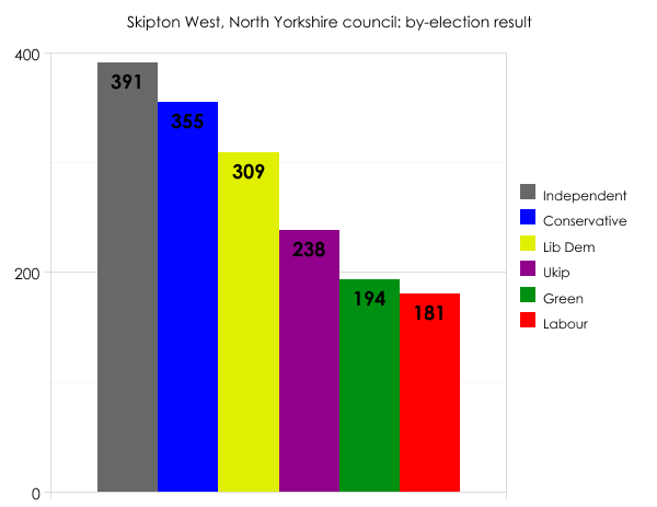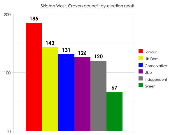 On the Tory-run Craven council in North Yorkshire, Labour gained a seat from the Lib Dems on a 10.5% swing. That sounds quite impressive, but the number of votes cast was rather low: