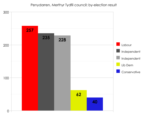 Labour’s second win came in Merthyr Tydfil. Ukip didn’t field a candidate to defend the seat it won here in 2012, so a gain was always on the cards. John McCarthy emerged the victor, increasing Labour’s majority on the council: