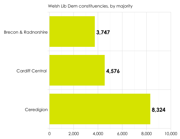 As with Plaid, two of the Lib Dems’ three seats are targets: Brecon & Radnorshire for the Tories and Cardiff Central for Labour. Only Mark Williams in Ceredigion is safe.