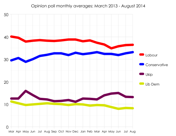 As usual, here’s a look at how August’s poll averages sit within a long-term context. This time I’ve gone back 18 months instead of 12, to show how Ukip’s 2013 bounce compares with that of 2014: