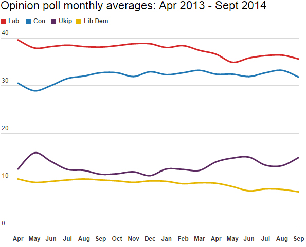 After a quiet couple of months, the polling averages for all main parties are on the move – and it’s Ukip alone that has reason to be cheerful.