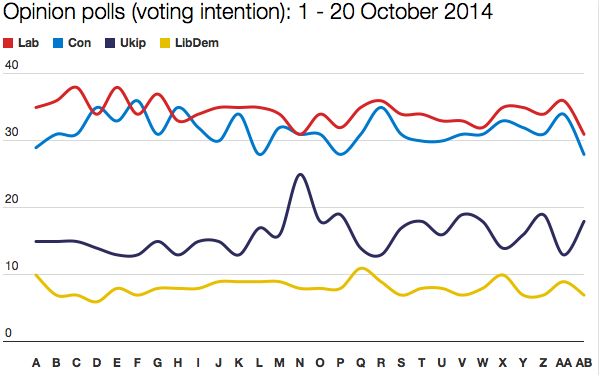 The latest averages for October are Labour 34.4%; Conservatives 31.6%; Ukip 15.9%; Liberal Democrats 8.1%.