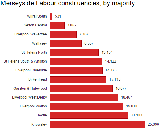 The one constituency that may see a change is Wirral West, the seat of Tory employment minister Esther McVey. She has a majority of 2,436, and would lose on a swing to Labour of 3.1%. It’s the sort of constituency that would fall to a resurgent Labour party set to form the next government. But we’re no longer looking at that kind of Labour party, which means McVey may cling on. Her personal association with some of the coalition’s most controversial policies, however, may prompt a larger swing against her than elsewhere in the country, and she won’t want to take anything for granted. She will certainly fight a very tough campaign.