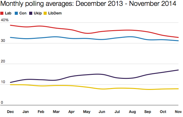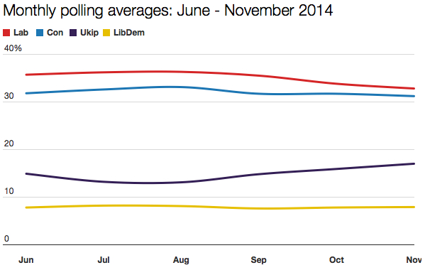 So far this month Labour has been as high as 35% and low as 29%, while the Tories have peaked at 34% and dipped as far as 27%. The Lib Dems have bounced around between 6% and 10%, while Ukip has been the most inconsistent of all, polling up at 24% and down at 13%.