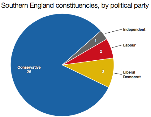 I’m completing my tour of the electoral map near where I began: in southern England. The three counties of Gloucestershire, Hampshire and Wiltshire are almost solid blocks of blue. But both Labour and the Liberal Democrats have a presence in the region, and Labour could well increase its toehold come the election: