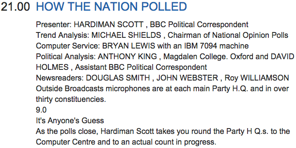 By the 1964 general election the Home Service’s election coverage had become more substantial, dropping the entertainment and focusing exclusively on results and analysis: