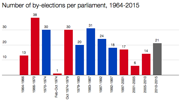 It means that the total number of by-elections in the 2010-15 parliament stands at 21. This is the highest amount since the 1987-92 parliament: