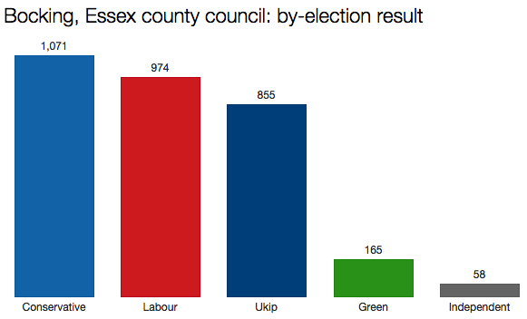 The only seat to change hands on Thursday was outside London. A seat on Essex county council was gained by the Tories from Ukip: