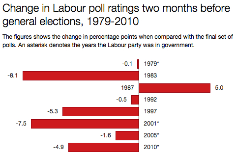 Note that on the four occasions when the Conservatives were fighting an election as the government, their poll ratings went up as the election approached. Only in 2005 did the party’s rating barely change. As for 1979, the Tories were so far ahead two months before the election that they could afford to drop 7.3 points and still go on to win.