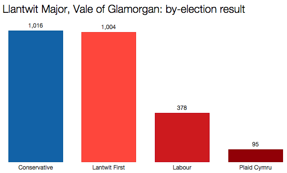 Finally, there was a by-election for the Vale of Glamorgan council in Wales. In a very close result, the Conservatives sneaked ahead of the Llantwit First group to win the seat: