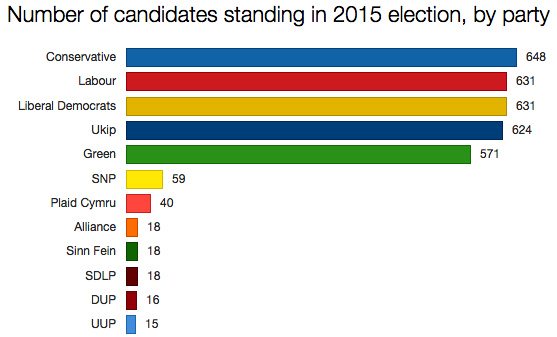 3. The Conservatives are fielding the most number of candidates across the whole of the UK. This is because unlike Labour and the Lib Dems they’ve decided to stand in 16 of the 18 seats in Northern Ireland – something about which I’m not sure the Ulster Unionists and DUP will be particularly thrilled. The two they’ve decided to miss are Femanagh & South Tyrone and Belfast North. Meanwhile Ukip is fielding a total of 624 candidates, up on 558 in 2010. There are 650 seats in the UK, which means there must be 26 seats which for whatever reason the party has decided not to bother with.