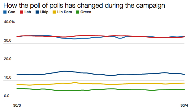 As for the poll of polls, I’m sure it won’t come as a surprise to learn that it has barely shifted since the campaign began. One month ago, the Tories were on 33.6% and Labour were on 33.8%; the latest figures are 33.9% for the Tories and 33.6% for Labour: