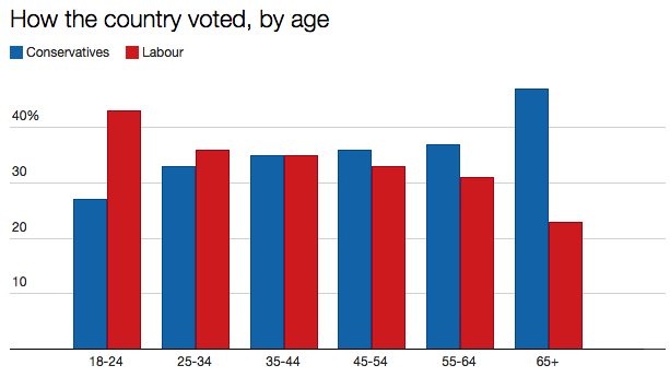 There was a swing of 5.5% from Labour to the Conservatives among the 65+ age group. There was a bigger swing of 7.5% in the other direction among 18-24 year-olds. But only 43% of that age group bothered to vote, while a massive 78% of voters aged 65+ did.