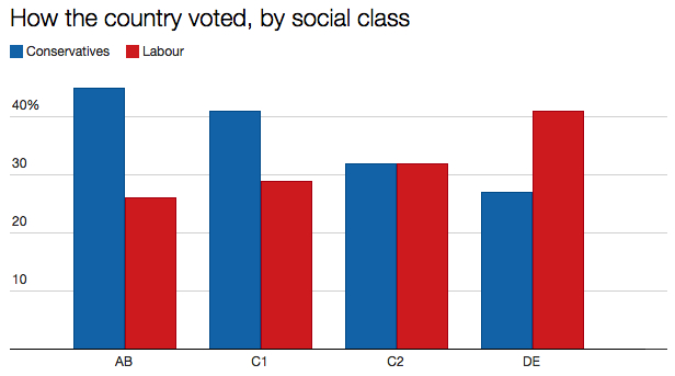 The Tories had a 19-point lead over Labour among AB voters, where turnout was 75%. Turnout among DEs was just 57%.