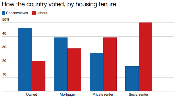 Guess which of these groups saw the highest turnout? Of course: owners, 77% of whom voted. By contrast, a measly 51% of voters renting social housing cast a ballot.